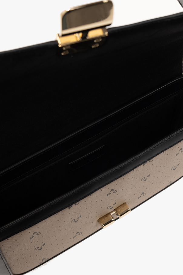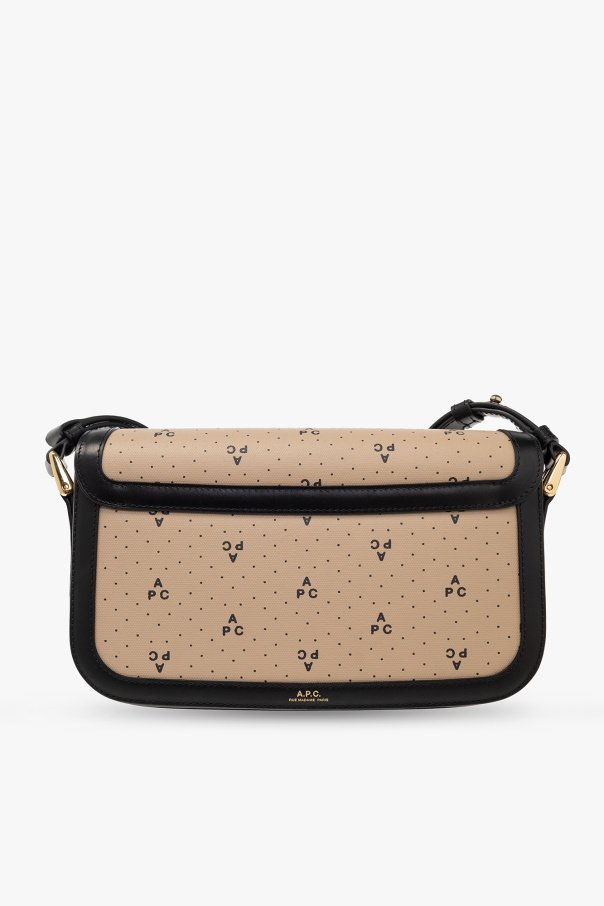 Beige and black ‘Grace Baguette’ shoulder bag from A.P.C. Made of coated canvas with leather trims, this model is complete with a flap with a decorative snap closure, logo pattern, adjustable shoulder strap, gold-tone metal hardware and one internal compartment with one slip pocket.