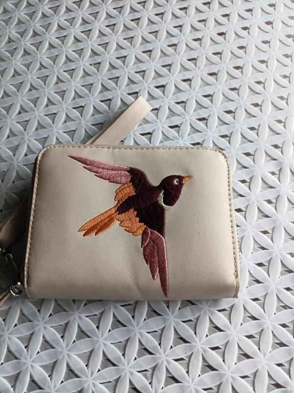 Очень классный кошелек, возможно портмоне бежевый цвет птичка сверху вышивка. имеет 13 отделений.высота 10 см. ширина 13 см. оплата продавца на карточку.