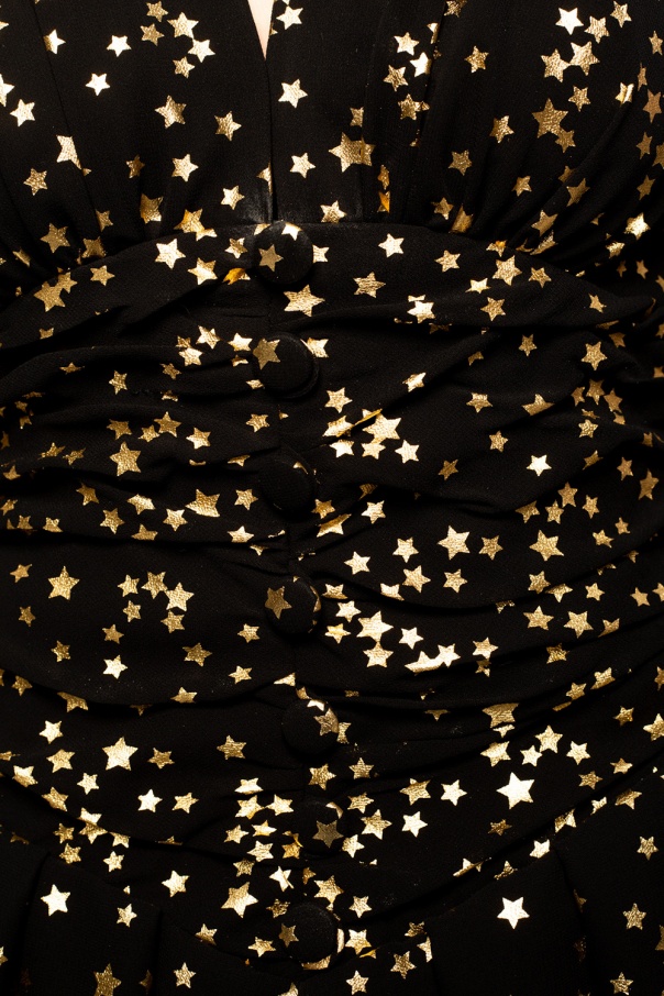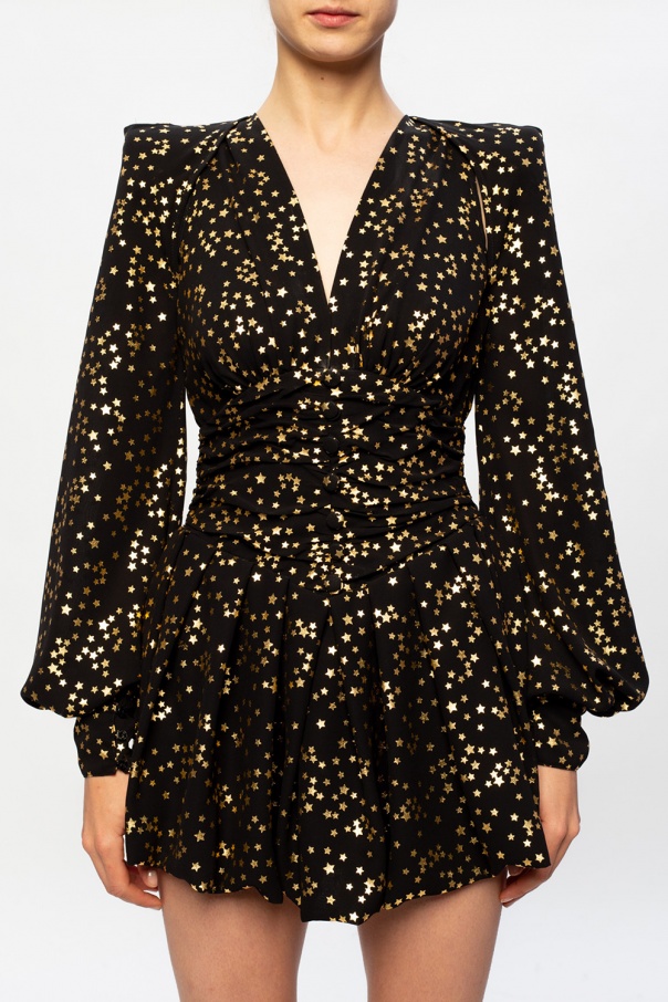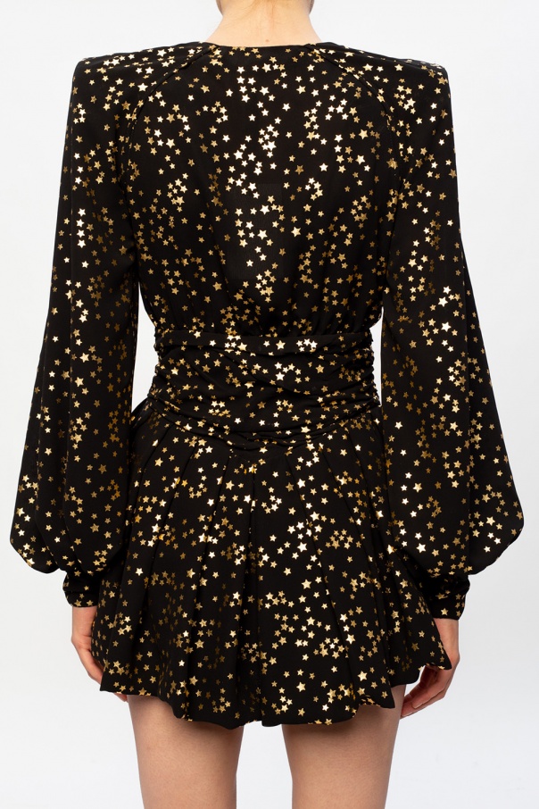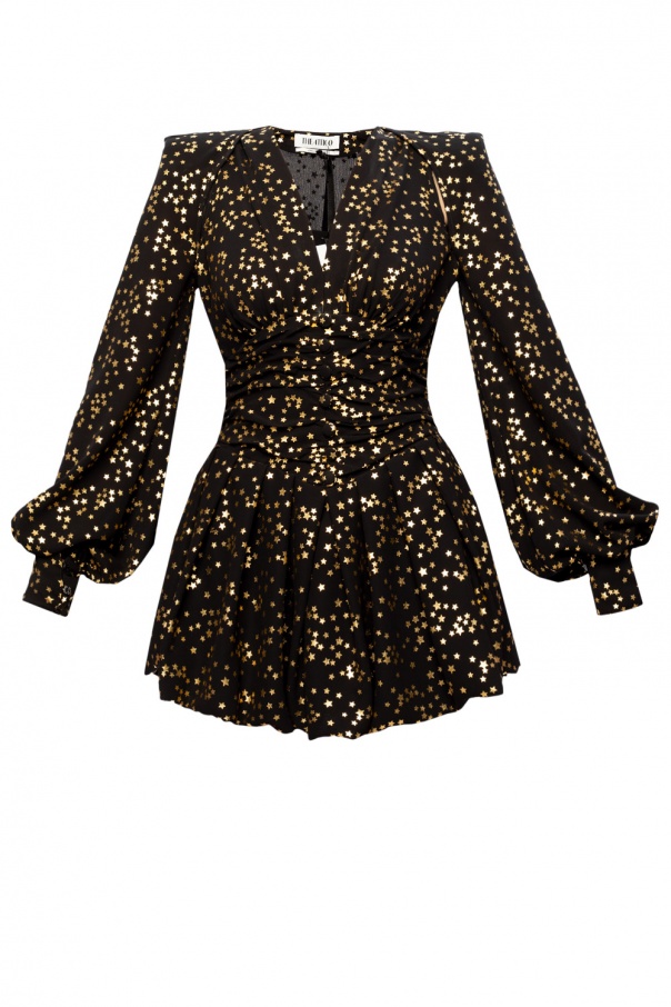 Black dress from The Attico. Fastened with a hidden zip on the side, this design features lining with snap fastening at the crotch, a printed star motif in gold-tone, gathers and buttons at the waist, long puff sleeves with banded cuffs, padded shoulders and a V-neck.