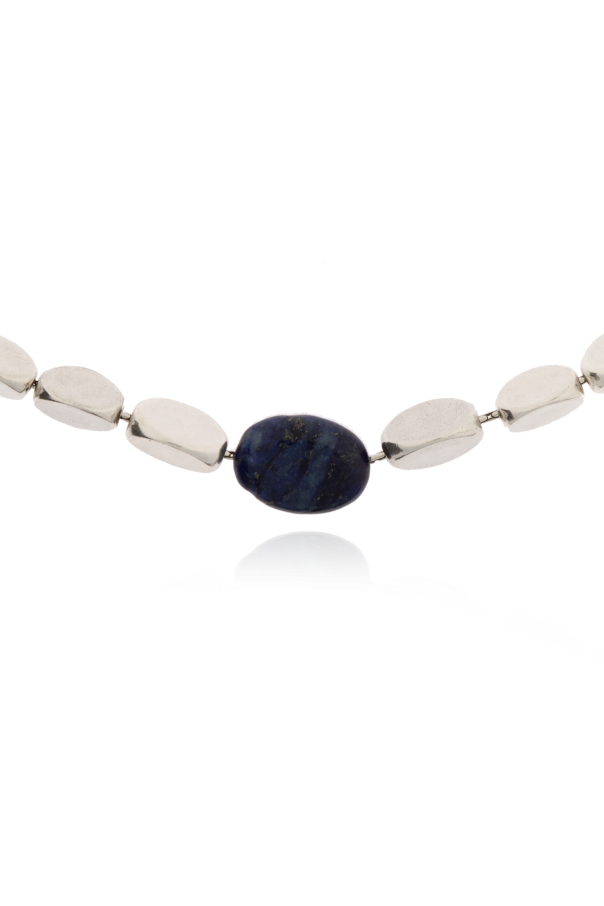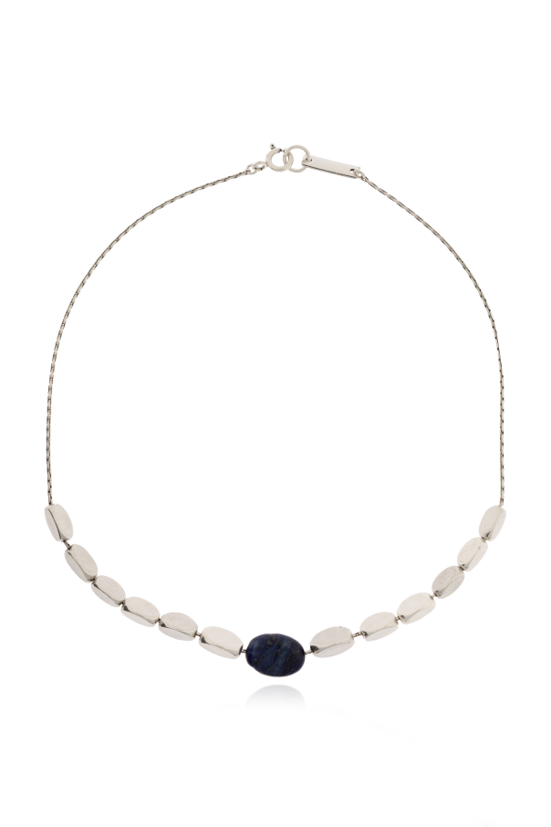 Introducing the exquisite Leotie Necklace, a masterpiece in the realm of women\'s jewelry, crafted by the illustrious Isabel Marant. This short necklace exudes an aura of understated elegance, composed of a series of silver-toned, oval links forming a refined chain. The centerpiece is a captivating blue, oval stone that offers a striking contrast to the silver elements, creating a harmonious blend of style and sophistication. The necklace is completed with a classic lobster clasp and an elegant chain with a ring, adding to its graceful allure. Designed with a minimalist aesthetic, the Leotie Necklace is a versatile accessory, perfect for everyday wear or to accentuate your ensemble on special occasions. Crafted with an artful combination of brass and stone, it epitomizes the timeless allure and effortless chic that define Isabel Marant\'s creations. Why Purchase This Product? Elegant, minimalist design perfect for any occasion. Features a striking blue stone centerpiece. Crafted by renowned designer Isabel Marant. Durable brass construction with a classic silver finish. Secure lobster clasp for effortless wear.