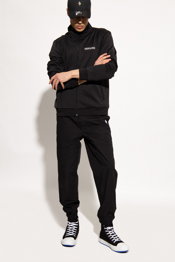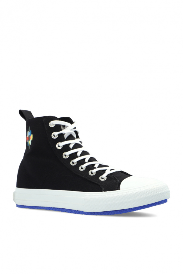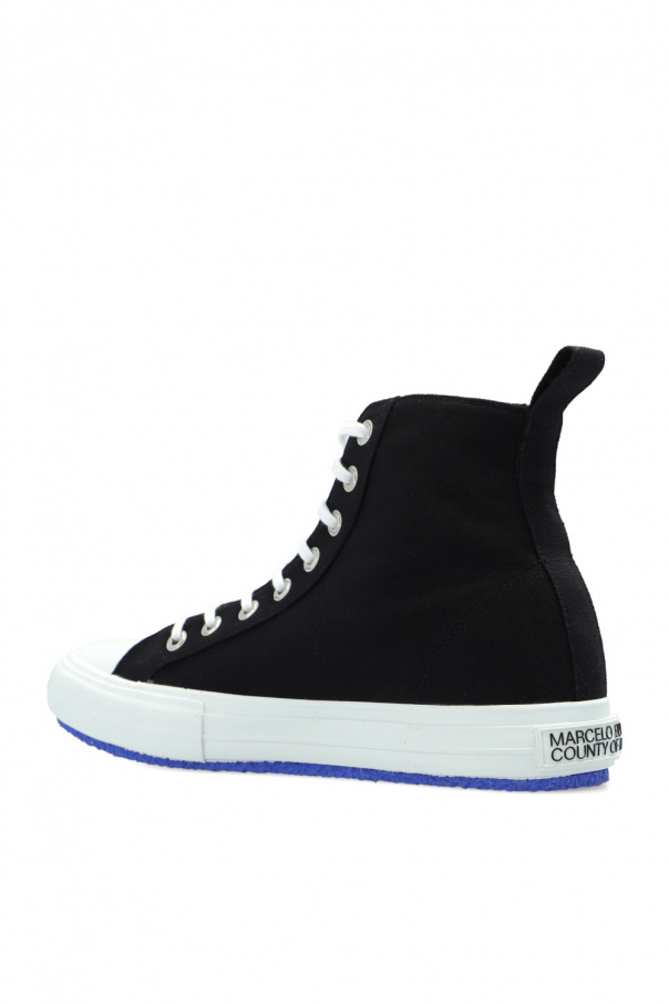Black and white high-top sneakers from Marcelo Burlon. Made of cotton, this lace-up pair features a multicolored logo embroidery and rubber sole with a raised logo in white and blue.
