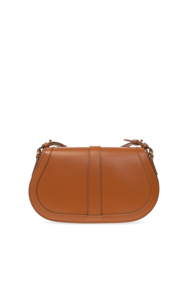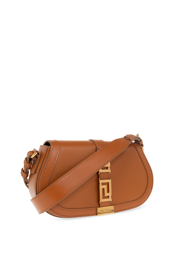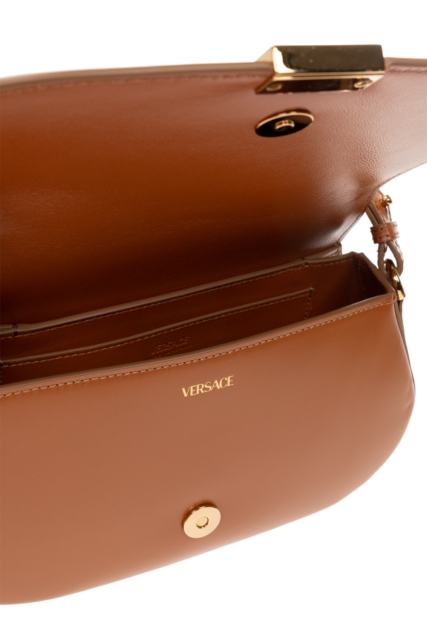 Brown ‘Greca Goddess’ quilted shoulder bag from Versace. Crafted from calf leather, this design secures with a snap and showcases the Greca hardware on the front of the flap. It is complete with a detachable and adjustable wide shoulder strap, gold-tone metal elements and one internal compartment with two slip pockets.