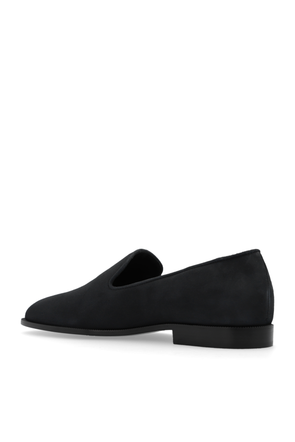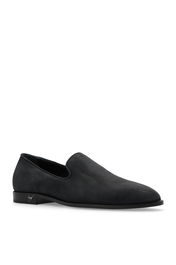 Dark grey ‘Gatien’ loafers from Giuseppe Zanotti. Made of suede. Decorated with a metal logo appliqué in silver-tone at the side and a black rubber sole.