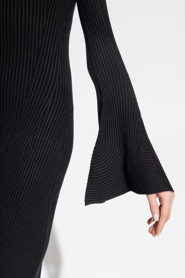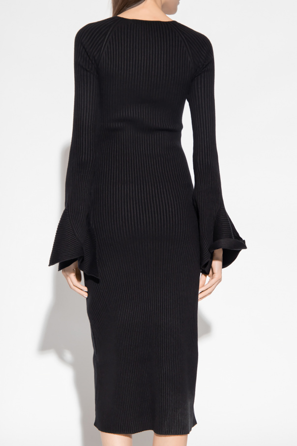 Black ribbed dress from Proenza Schouler. Crafted from a silk and cashmere blend, this round neck design has long sleeves with ruffles.