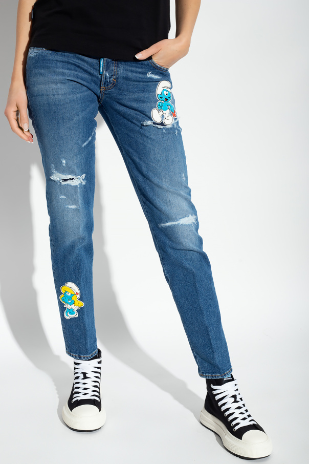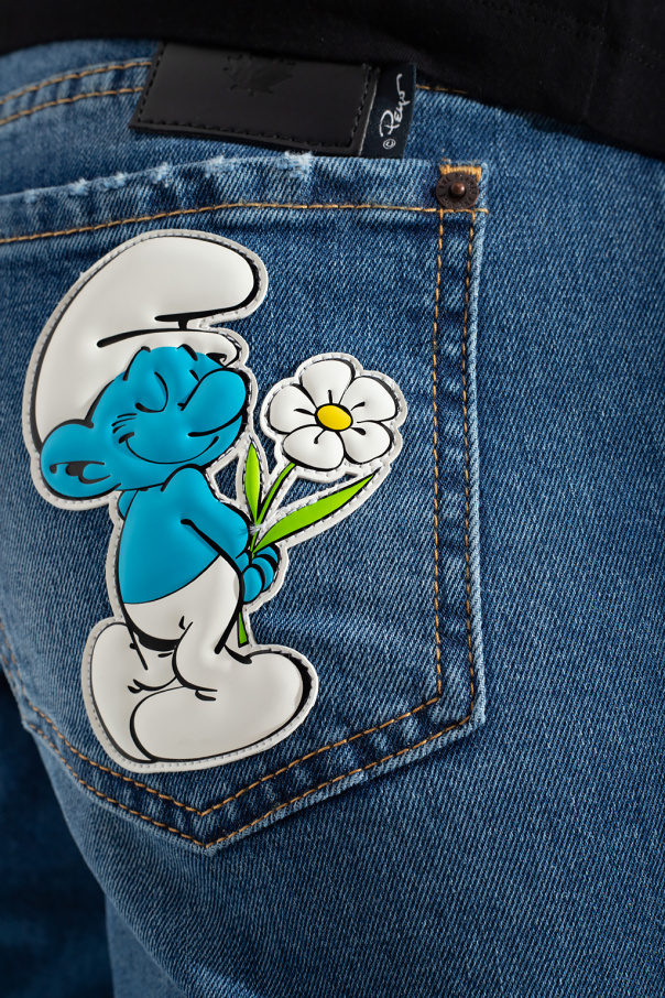 Navy blue jeans from Dsquared2 x The Smurfs, the ‘One Life One Planet’ collection. Made of cotton, this pair falls with tapered legs and features button closures, classic five pockets and colourful graphic embroidery with a motif of ‘The Smurfs’ comic franchise.