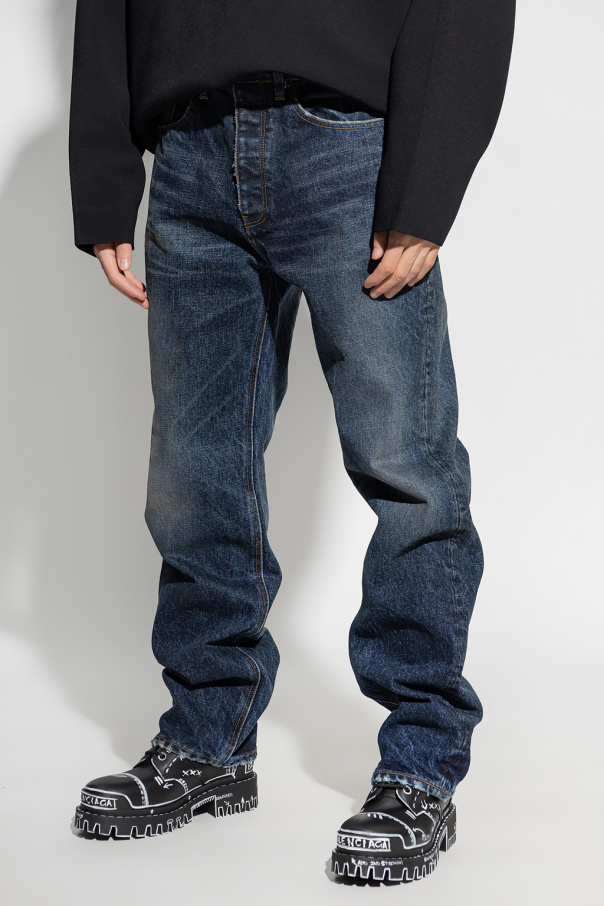 Navy distressed jeans from Balenciaga. Fastened with buttons, this straight leg pair is complete with three front pockets and two back pockets.