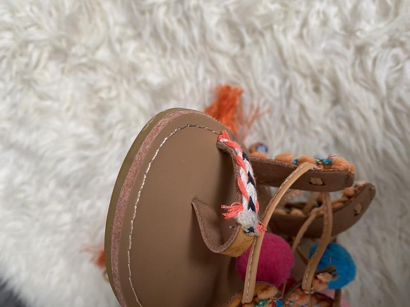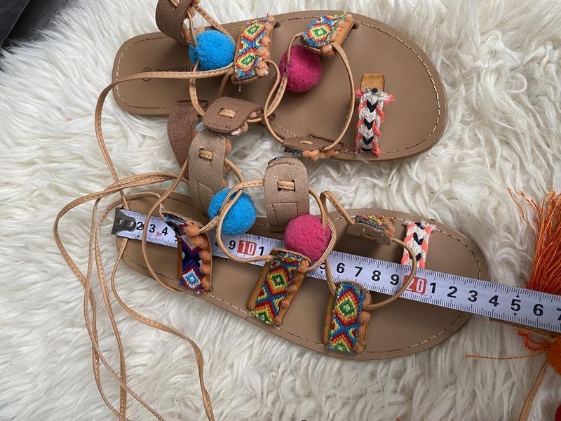 шнуровка завязывается на ногах на переплёт в конце шнуровки пушистые пумпончики )подошва на низком ходу с маленькими квадратными каблуками)