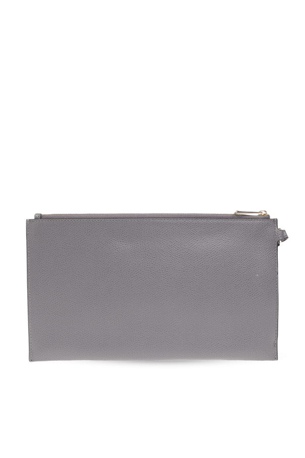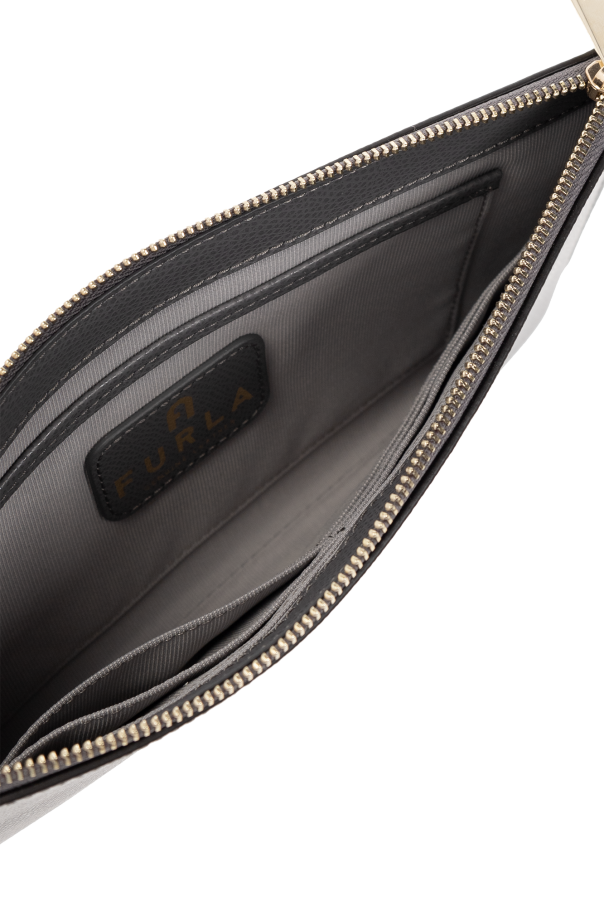 Dark grey ‘Camelia’ clutch from Furla. Made from grained leather, this design secures with a zip and showcases a logo application. It is complete with a short wrist strap, gold-tone metal hardware and one internal compartment with one slip pocket and six card slots.