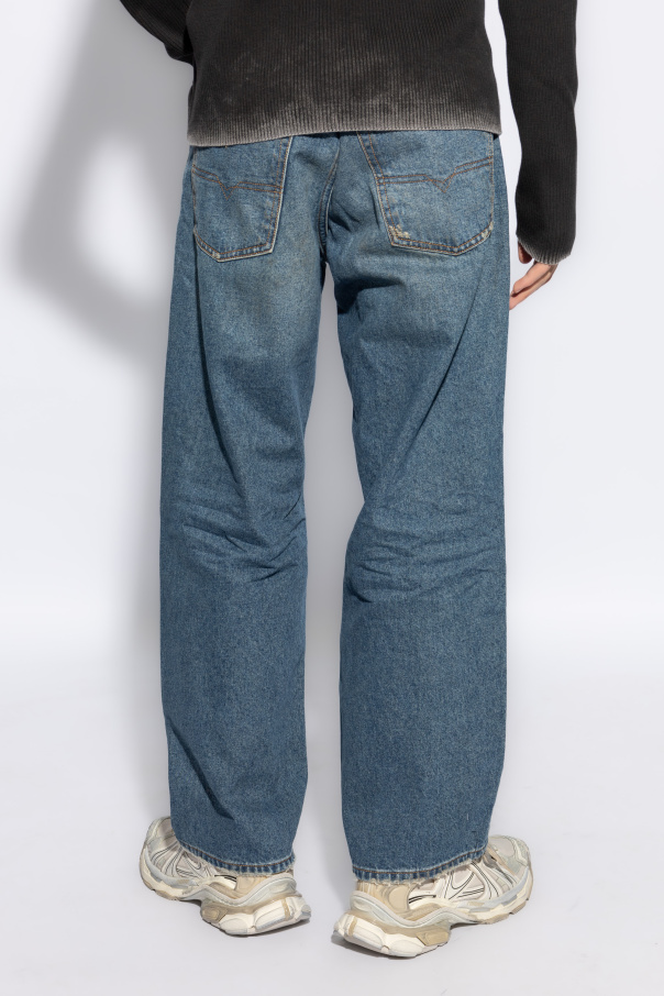 Introducing the epitome of timeless elegance and durability, the \'2001 D-MACRO L.30\' jeans by the renowned Diesel. Crafted from premium denim, these jeans are a testament to classic style and rugged sophistication. The dominant blue hue, accentuated with lighter washes and localized fading, adds a \"worn-in\" allure, seamlessly blending casual charm with an air of laid-back luxury. The straight-leg cut of these jeans offers a flattering fit for a variety of body types, ensuring comfort without compromising on style. The meticulous construction is evident in the dense weave of the denim, a hallmark of Diesel\'s commitment to quality, meant to withstand the test of time. Distinctive details such as the embroidered logo pocket and the iconic \"diesel industry\" patch with a red accent highlight the brand\'s meticulous attention to identity and design. Additional features like the classic five-pocket design, zip fly with button closure, and contrast yellow stitching underscore the jeans\' denim heritage and craftsmanship. Why Purchase This Product? Timeless Elegance: The classic straight-leg design and subtle distressed details offer an ageless aesthetic. Exceptional Quality: Made entirely from durable denim, these jeans promise longevity and resistance to wear. Signature Details: Features such as the distinctive logo and the unique stitching pattern underscore Diesel\'s iconic design ethos. Versatile Fit: Designed to accommodate a range of body shapes, these jeans offer a comfortable, loose fit with a mid-rise waist.