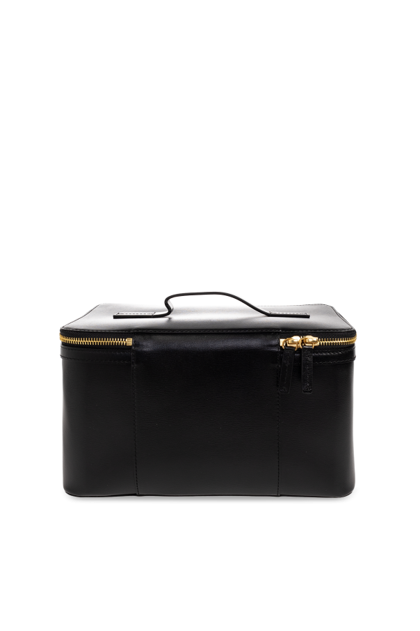 Black ‘Aya Beauty’ cosmetics case from By Malene Birger. Made of leather, this design secures via a two-way zip and features a half-round handle, gold-tone metal hardware and two compartments and a zip pouch inside.