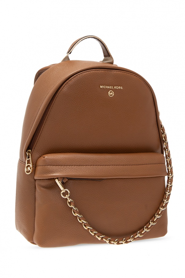 Brown ‘Slater’ backpack from Michael Kors. Crafted from cow leather with a texture throughout, this style fastens via zipper and employs a gold-tone logo plaque, an external zip pocket accentuated with a chain on the front, an external zip pocket on the back, a half-round top handle and adjustable shoulder straps in beige, and interior with one compartment and one slip pocket.