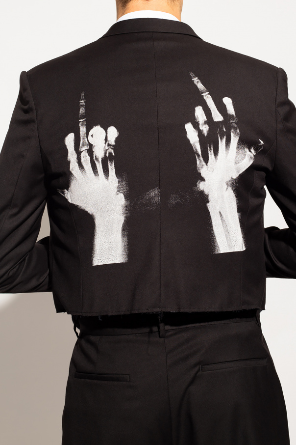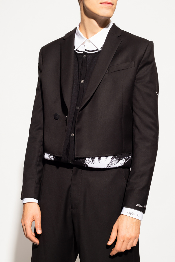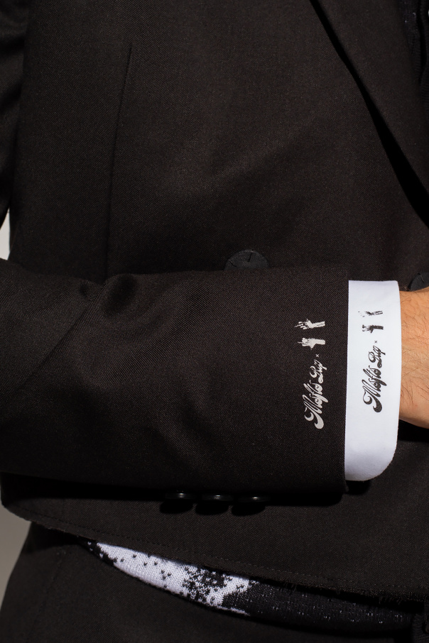 Black cropped blazer from MSFTSrep. Fastened with snaps, this garment features a printed pattern, white logo, notch lapels, slip pocket and long sleeves.