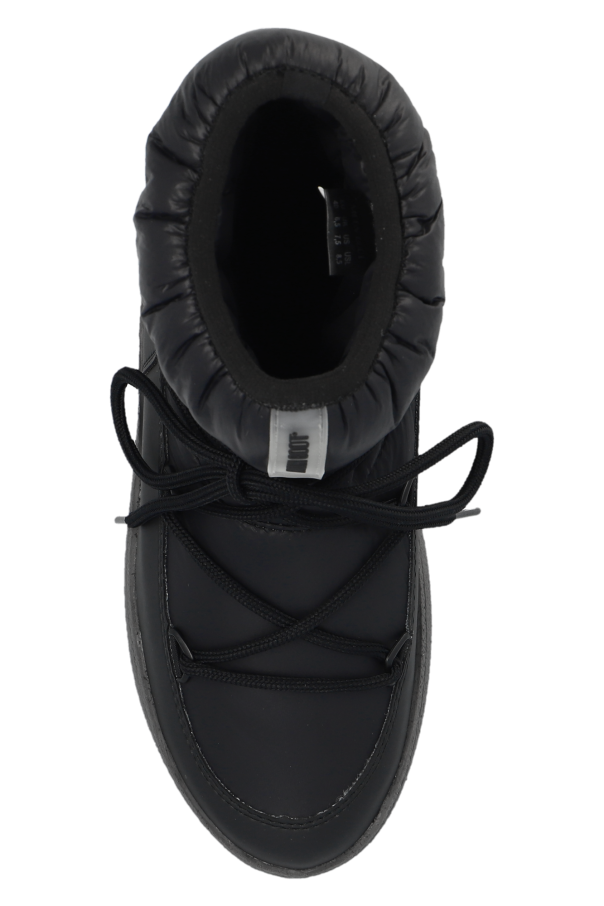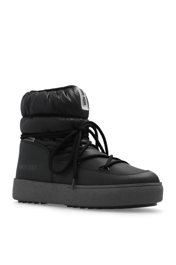 Black ‘Ltrack Low Nylon’ waterproof quilted snow boots from Moon Boot. Set on a light midsole and a grey rubber outsole with suction pads that offer serious ground control, this pair features criss-cross tubular laces (not to be used to tighten boots), elasticated cuffs and a logo. Inspired by the peculiar shape and technology of the astronauts' boots, the iconic style was designed in 1969 after the first Moon landing.