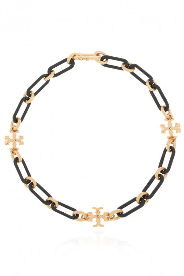 Black and gold-tone ‘Roxanne’ chain necklace from Tory Burch. Made of brass plated with 18k gold, this item is embellished with enamel and Double T appliqué.