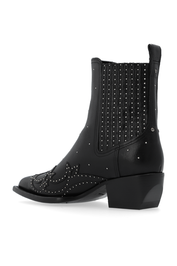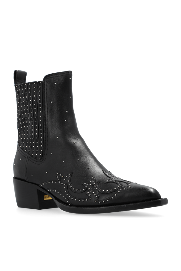 Introducing the ‘Beatles’ Heeled Ankle Boots from the exclusive collection by Golden Goose. These boots, with their dominant black hue, exude a blend of sophistication and edgy allure that is second to none. Crafted from premium leather, both inside and out, these boots promise not only unmatched style but also enduring quality. The boots feature a distinctive pointed front and a moderate heel, embodying the essence of this shoe category with grace and poise. The surface is adorned with delicate, decorative perforations and embellishments, creating an elegant, western-inspired motif. The larger, more pronounced patterns at the front add a touch of character, making these boots a statement piece. Additionally, the boots are designed with elastic side inserts, ensuring ease of wear and a snug fit. The solid, stable heel further guarantees comfort, allowing for prolonged wear without sacrificing elegance. Why Purchase This Product? Exquisite Craftsmanship: Made entirely of leather, these boots are a testament to quality and durability. Unique Design: The western motif, combined with the boots\' sleek black color and pointed front, offers a timeless appeal. Comfort and Ease: Elastic side inserts and a stable heel ensure comfort and ease of wear, making these boots a practical choice for any occasion. Elegance and Style: With the absence of overt branding, these boots maintain an understated elegance, allowing their design and quality to shine through.