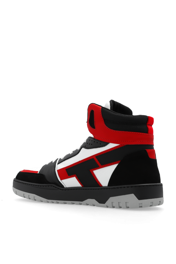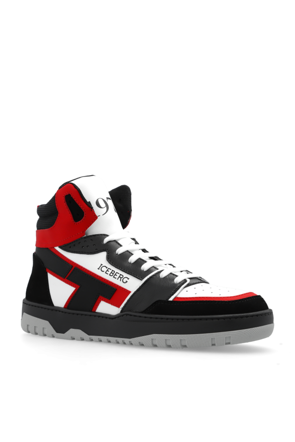 White, black and red high-top sneakers from Iceberg. Made of leather and fabric, this lace-up pair sits on a grey and black rubber sole and is enriched by perforations and a logo print.