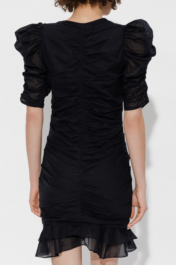 Black ‘Sireny’ mini dress from Marant Étoile. Made of cotton. Fastened with a side zip, this fitted, draped design features a V-neck and long sleeves.