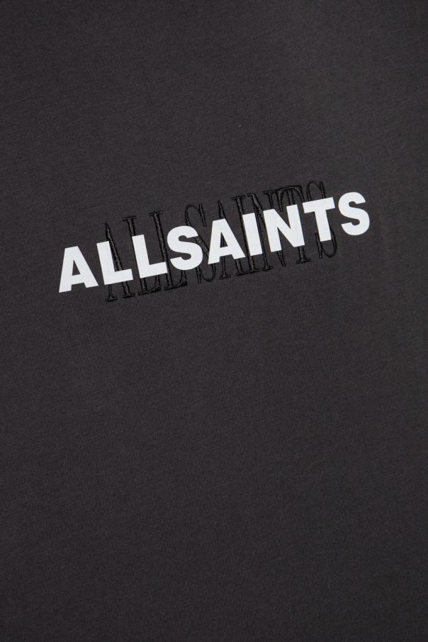 Dark grey ‘Veil’ T-shirt from AllSaints. Made of organic cotton, this short sleeve design features a printed and embroidered logo pattern in white and black as well as a ribbed crew neck.