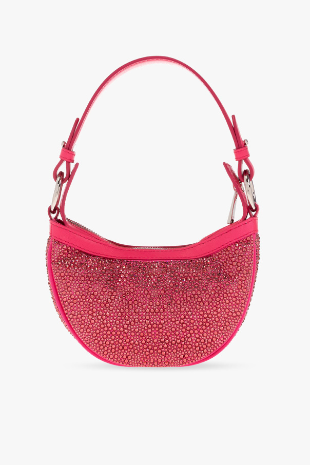 Pink ‘Repeat Mini’ handbag from Versace. Crafted from satin and embellished with all-over glossy crystals, this design fastens with a zipper and features the brand\'s signature Medusa face emblem on the front, short and detachable strap, leather trims, silver-tone metal hardware and one internal compartment with a zip pocket.