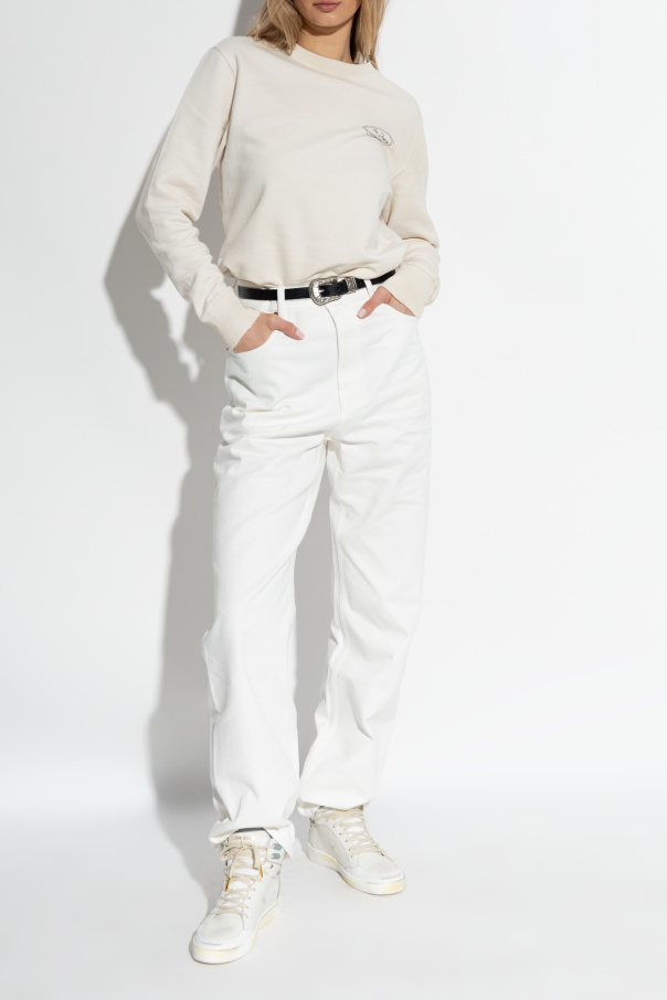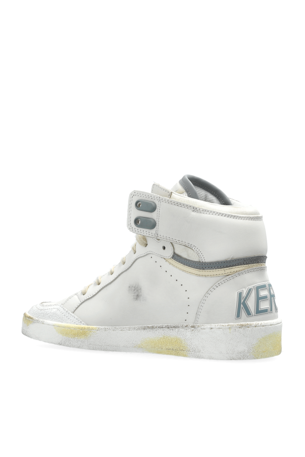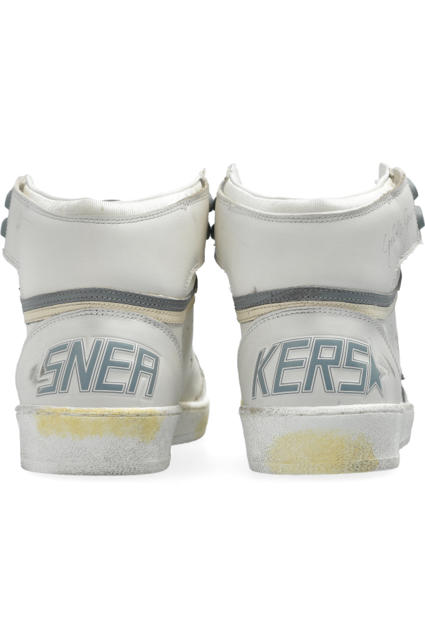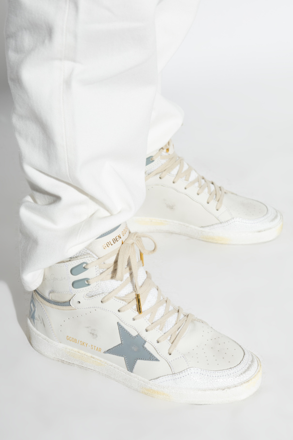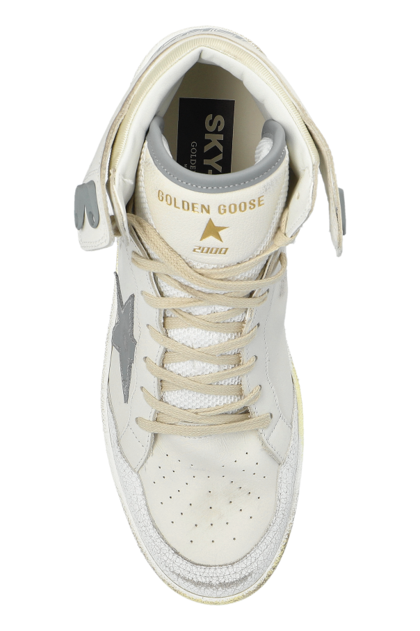 Indulge in the luxurious allure of the Sky Star With Padded Tongue sneakers from the esteemed Golden Goose collection. These high-top sneakers, crafted with meticulous attention to detail, exude an unparalleled blend of elegance and sporty flair. Adorned in a pristine white with subtle gray accents, these sneakers feature a classic shape that embraces the ankle. The hallmark star embellishes the side, while the tongue showcases the iconic \"GOLDEN GOOSE\" inscription and logo. The heel proudly displays the word \"SNEAKERS,\" adding an extra touch of sophistication. Constructed from premium leather and materials, these sneakers boast perforations on the front for enhanced breathability. The combination of lace-up and velcro strap closures at the ankle ensures a secure fit, while the artfully pre-aged sole epitomizes Golden Goose\'s distinctive vintage aesthetic. Why Choose This Product? Exquisite craftsmanship from Italy\'s luxury brand, Golden Goose. Unique design with iconic star and vintage charm. High-quality leather for superior comfort and durability. Versatile style suitable for both casual and refined ensembles.