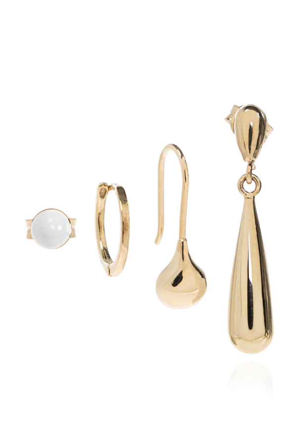 Indulge in the timeless elegance of the Set of Four Single Earrings by Lemaire, a beacon of minimalist sophistication. Each earring, crafted from rhodium-plated sterling silver, embodies a unique charm and distinct form. The collection features a classic white pearl stud, a sleek gold hoop, a drop-shaped dangling earring, and a striking teardrop pendant. With a dominant golden hue, these earrings are unisex, offering universal appeal and versatility. This exquisite set allows for personalized combinations, suitable for any occasion, from casual elegance to formal allure. Why Choose This Product? Expertly crafted by Lemaire, a leader in avant-garde fashion. Made from durable rhodium-plated sterling silver. Unisex design allows for versatile styling. Four distinct shapes offer endless mix-and-match possibilities. Combines classic elegance with modern minimalism.
