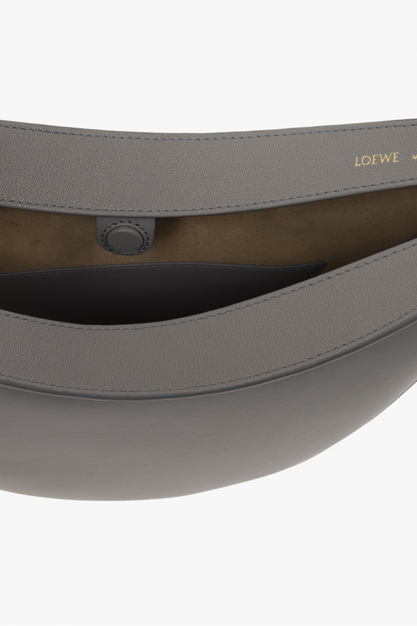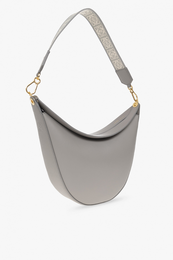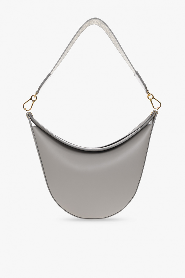Grey ‘Luna’ shoulder bag from Loewe. Made of calf leather, this model features a magnetic snap, embossed logo, detachable logo-embroidered strap, gold-tone metal hardware and one internal compartment with one slip pocket.