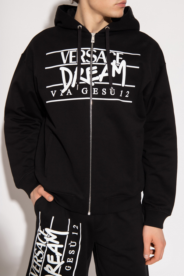 Black sweatshirt with a drawcord-adjustable hood from Versace. Crafted from cotton jersey, this style showcases a zip fastening, two slip pockets, elasticized edges and a white graphic print with the brand\'s signature ‘Dream Via Ges’ logo.