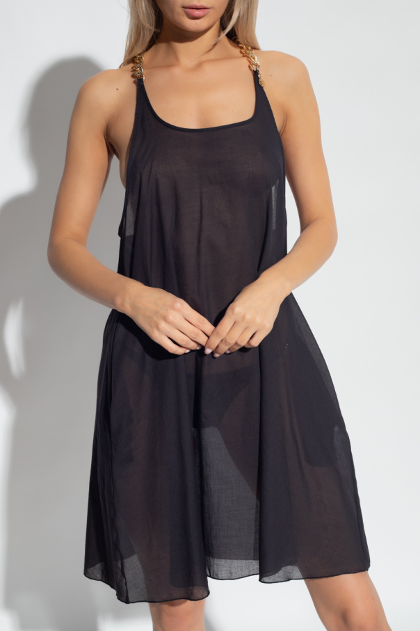 Black mini beach slip dress from Stella McCartney. Crafted from transparent organic cotton with a relaxed fit, this style features a halter neckline with the brand\'s signature gold-tone chain trimming on the shoulder straps and a logo-engraved application at the back.
