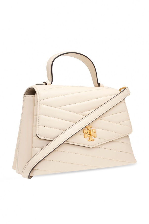 Cream ‘Kira’ quilted shoulder bag from Tory Burch. Crafted from leather, this model features a logo closure, back slip pocket, half-round leather handle, decorative chain handle, detachable and adjustable shoulder strap, gold-tone metal hardware and three internal compartments with one zip pocket and two card slots.