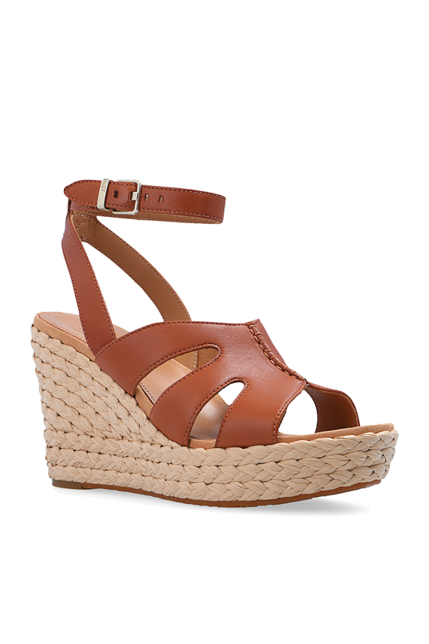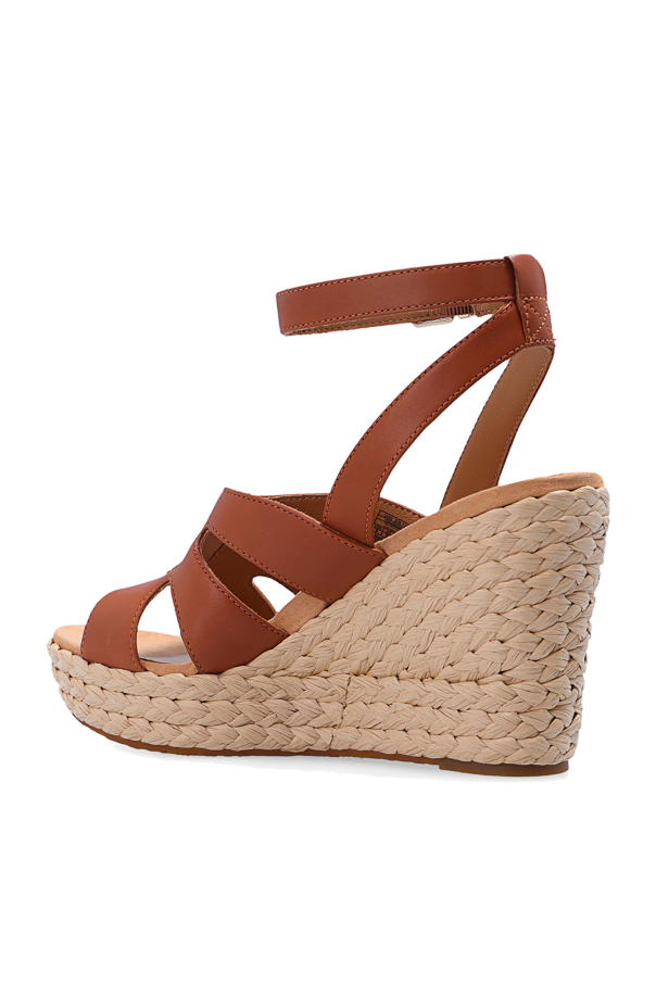 Brown ‘Careena’ wedge sandals from UGG. Made of leather, this model features an ankle buckle strap fastening, distinctive topstitched detailing on the front and a brown rubber sole with a beige raffia overlay.