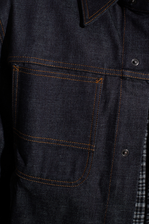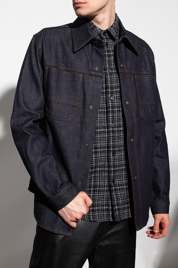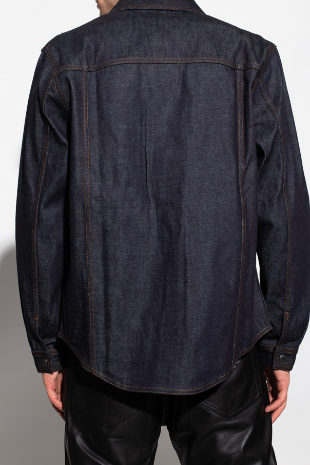 Navy blue denim shirt from Ami Alexandre Mattiussi. Enriched by orange stitching details, this style features snap fastenings, long sleeves and two slip pockets on the front.