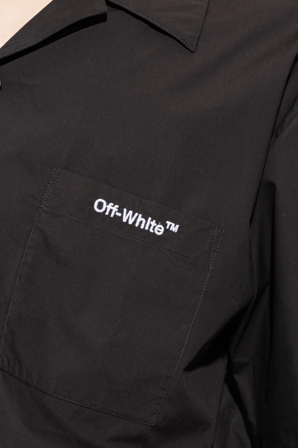 Black shirt from Off-White. Crafted from cotton with a relaxed fit, this style fastens with buttons and showcases a slip chest pocket, short sleeves, white logo embroidery on the front and the brand\'s signature arrows at the back.