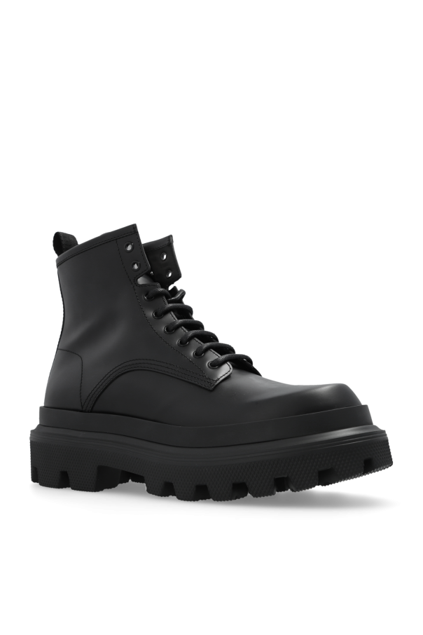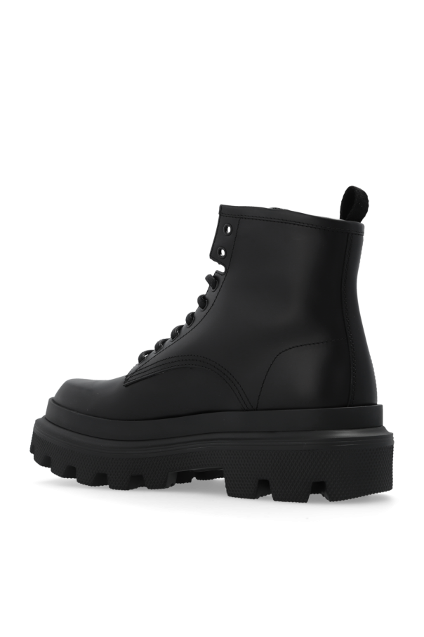 Black combat boots from Dolce & Gabbana. Made of calf leather, this lace-up pair features a logo-embossed insert in silver-tone metal on the tongue and black rubber sole with an embossed geometric pattern.