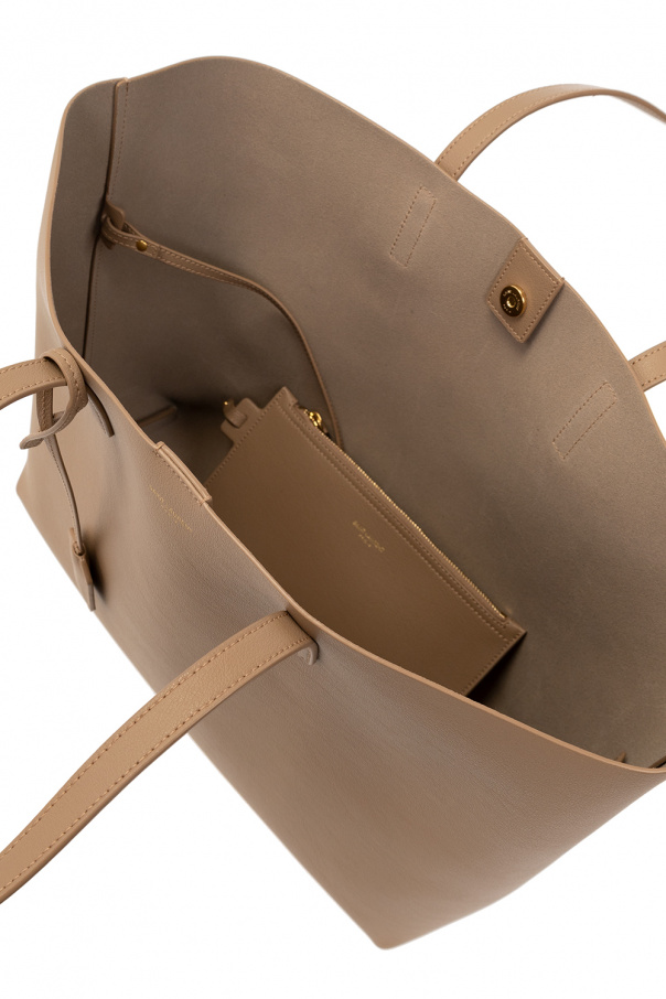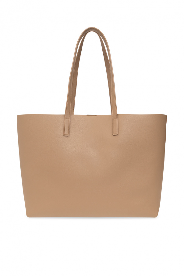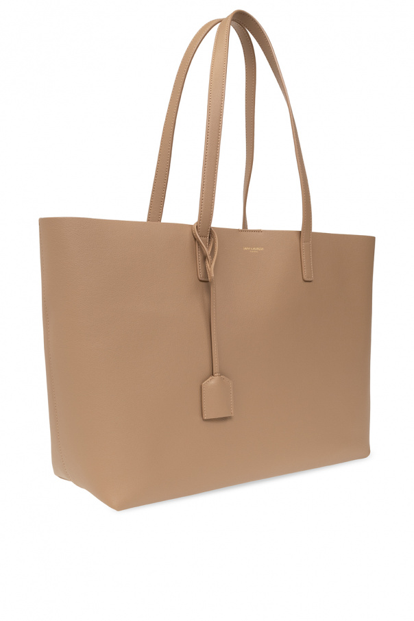 Beige shopper bag from Saint Laurent. Made of calf leather, this model features a snap closure, gold-tone logo print, strap with a metal charm in antique gold-tone, two half-round handles and one internal compartment with a removable zipped pouch.
