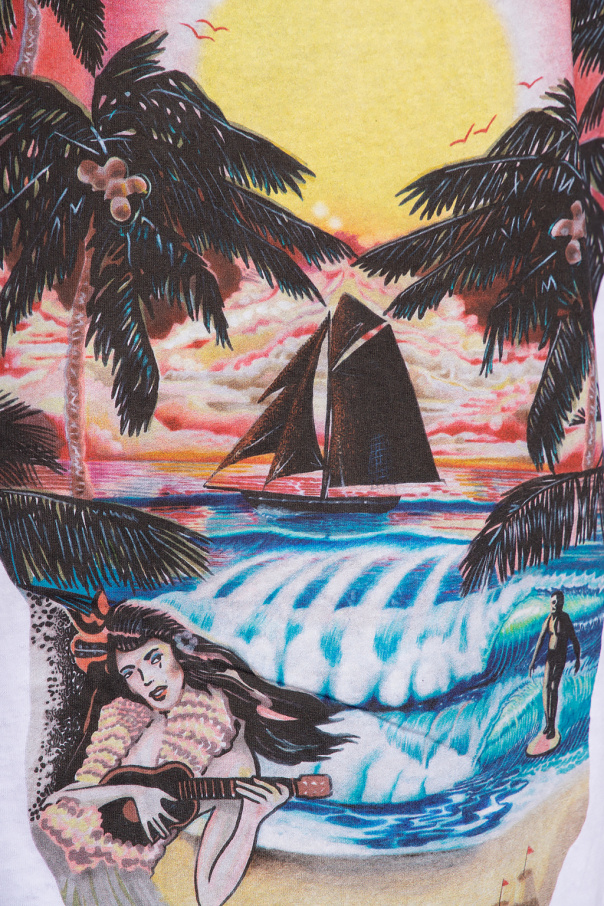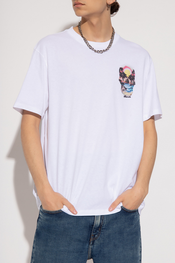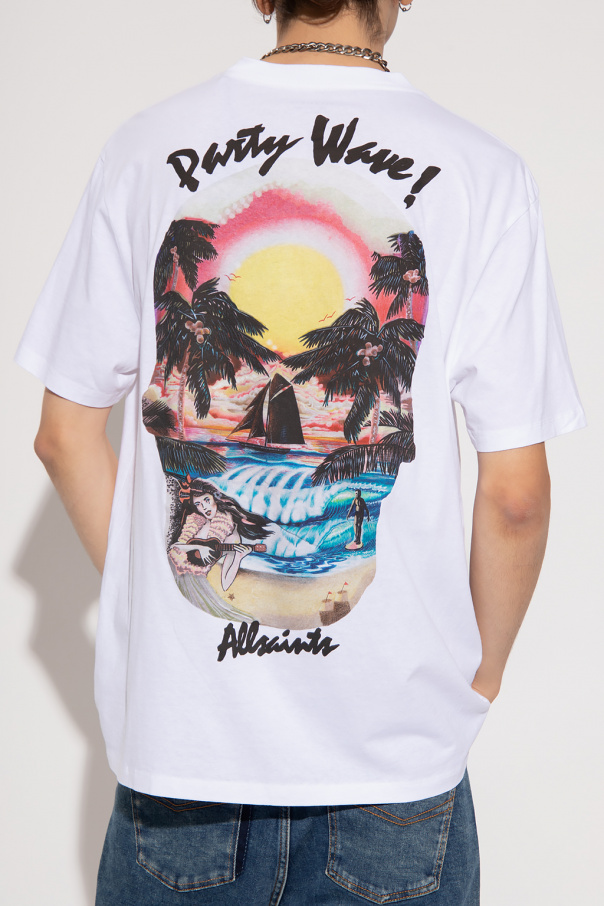 White ‘Rockaway’ crewneck T-shirt from AllSaints. Made of cotton, this style features short sleeves, an elasticated collar and a colourful graphic print with the brand\'s logo.