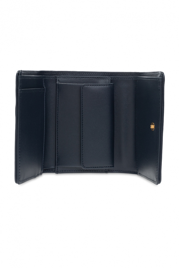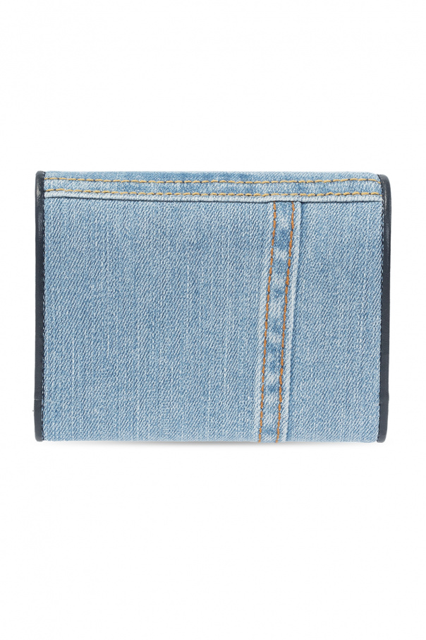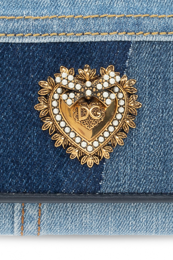 Navy blue and blue wallet from Dolce & Gabbana. Made of cotton denim and finished with black leather trims, this item fastens via a snap and features a logo-embossed appliqué, antiqued gold-tone metal hardware as well as two card slots, two slip pockets, two bill compartments and one snap-fastened pocket inside.