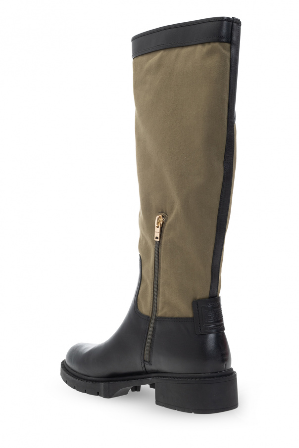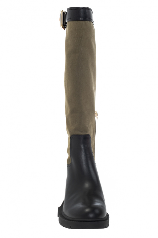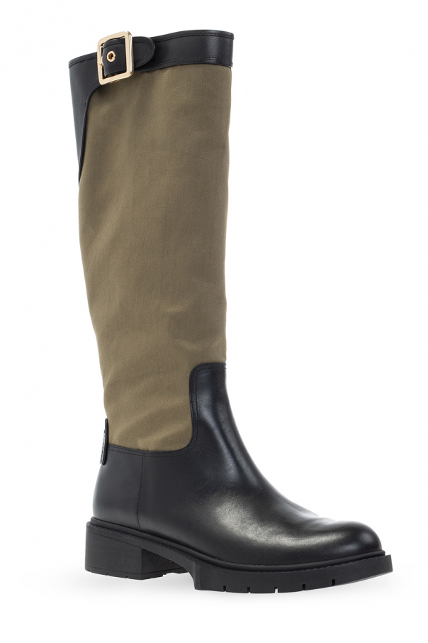 Black and green ‘Leigh’ boots from Coach. Crafted from leather and finished with fabric, this model sits on a black rubber sole and features a logo application on the back and a side zipper accompanied by a strap with a gold-tone buckle.