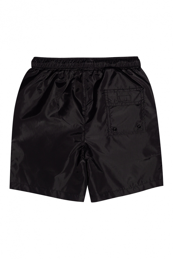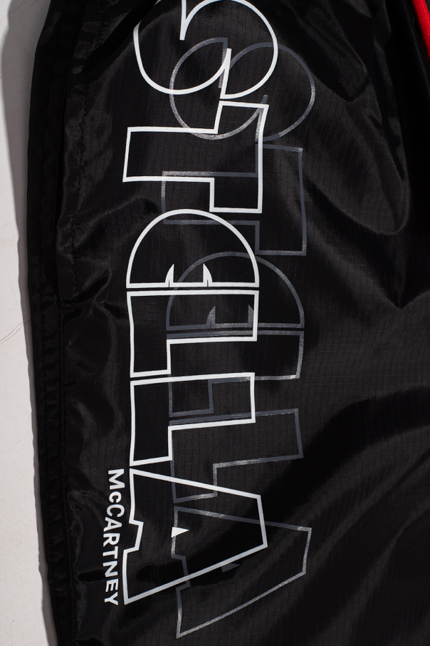 Black swim shorts from Stella McCartney Kids. This design features red and yellow drawstrings, grey and white logo print, two front pockets and a velcro pocket at the back.