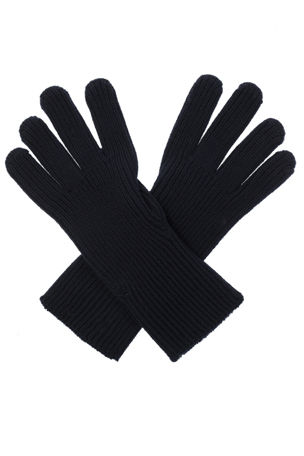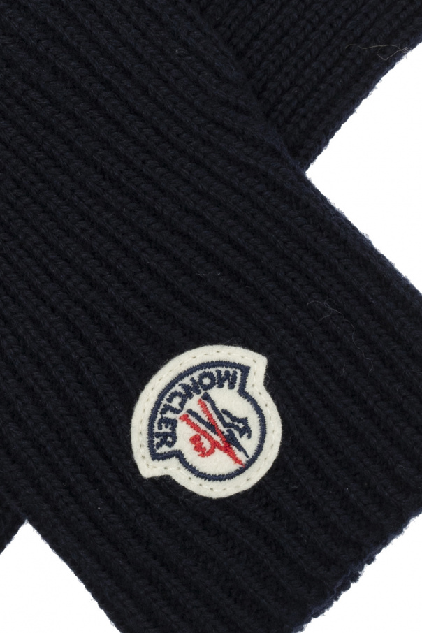 Navy gloves from Moncler. Made of wool, this item is decorated with a logo patch in cream, navy and red.