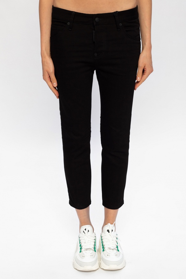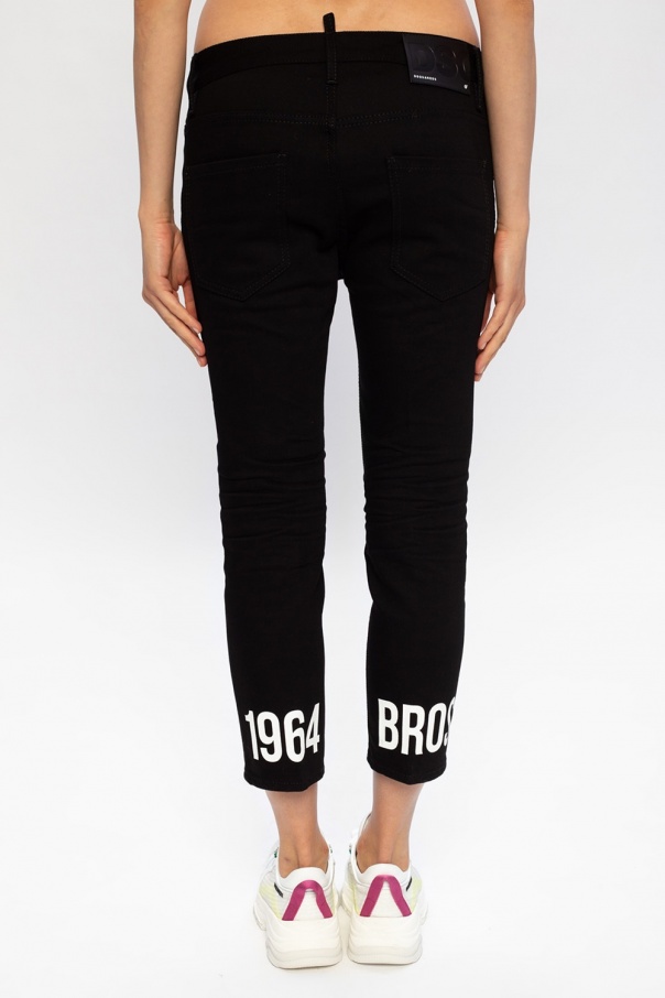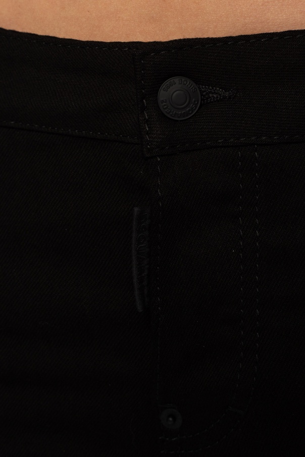 Black jeans from Dsquared2. Fastened with a zip and buttons. Decorated with a logo patch and a print at the cuffs. 5 slip pockets. Straight legs.
