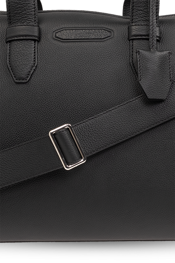 Introducing the quintessence of sophistication and functionality - the Brioni Black Handheld Bag. Crafted from the finest 100% grain leather, this accessory stands as a paragon of luxury design, characterized by its sleek, rectangular shape with gently rounded corners. The bag’s distinguished appearance is further accentuated by its silvery metallic fittings and zippers, epitomizing elegance with every detail. Designed for the discerning individual, the bag features two robust handles for hand carrying and an additional, detachable and adjustable shoulder strap, offering versatility and ease of use. The front of the bag showcases a small, distinct logo of the renowned designer, Brioni, mounted on a metal plaque, subtly emphasizing its exclusive origin. The interior does not fall short of expectations, lined with premium quality material and organized with a secure zippered pocket alongside a slip pocket, ensuring your essentials are kept safe and accessible. Precision stitching throughout the bag attests to its meticulous craftsmanship and unwavering attention to quality. Why Buy This Product? Constructed from 100% high-grade grain leather for lasting durability and a touch of luxury. Features a versatile carrying option with both hand straps and a detachable shoulder strap. Enhanced security with a dual-direction zipper and an additional key-locked padlock. Interior and exterior pockets, including a zippered interior pocket for safekeeping of valuable items. Adorned with the exclusive Brioni logo, symbolizing elegance and status.