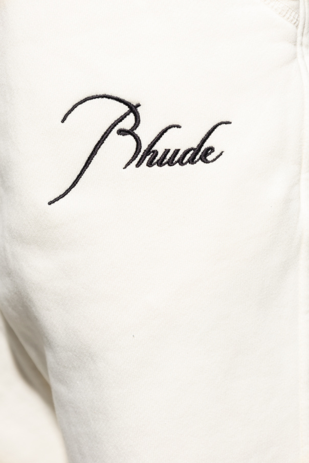 Cream trousers from Rhude. Crafted from cotton, this pair features an elastic drawstring waistband, embroidered logo pattern, four slip pockets and ribbed cuffs.