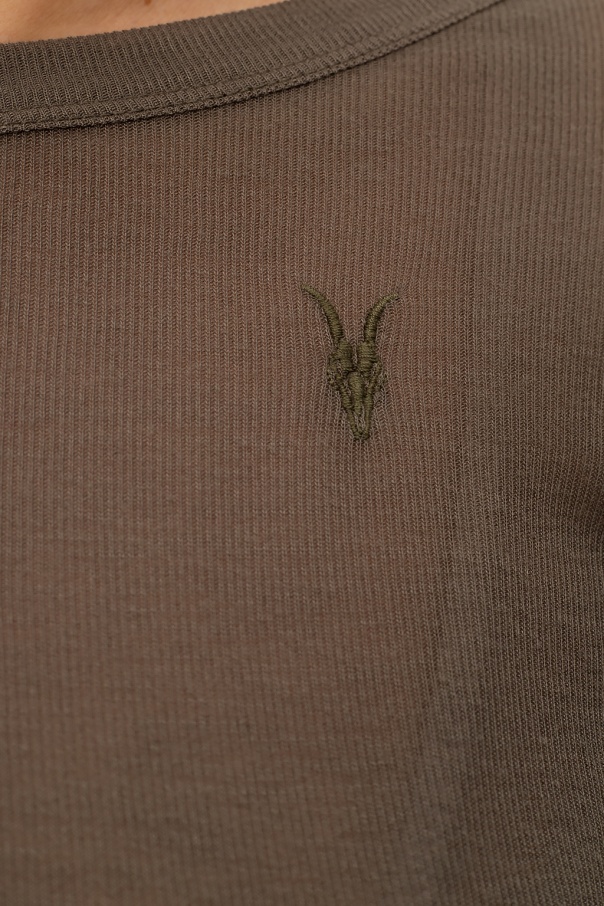 Dark green \'Francesco\' top from AllSaints. Embroidered with the Ramskull logo, this style is complete with a round neck and long sleeves.