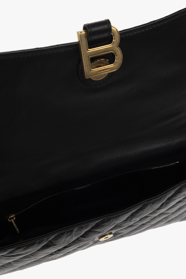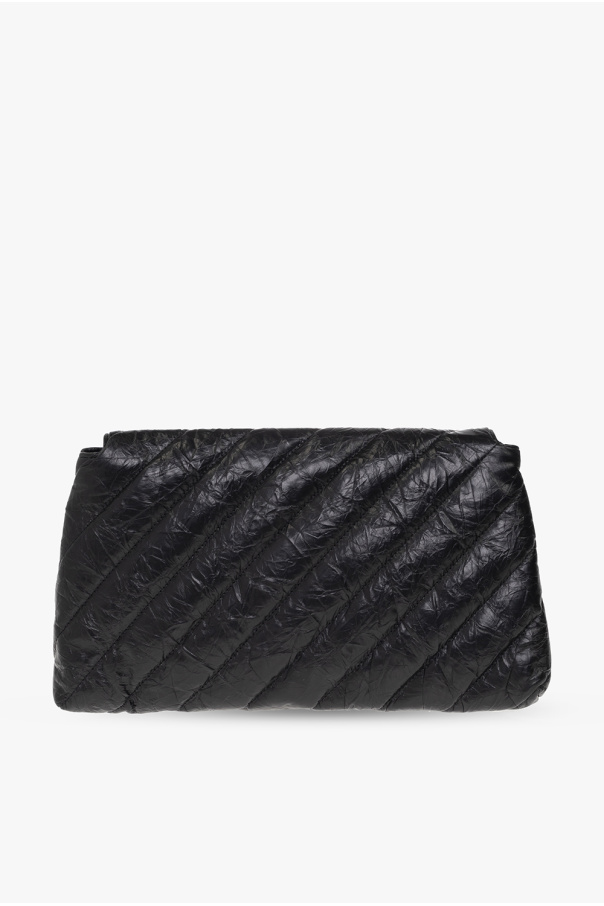 Black ‘Crush Large’ quilted clutch from Balenciaga. Made of calf leather, this item features a snap closure, one internal compartment and gold-tone metal hardware.