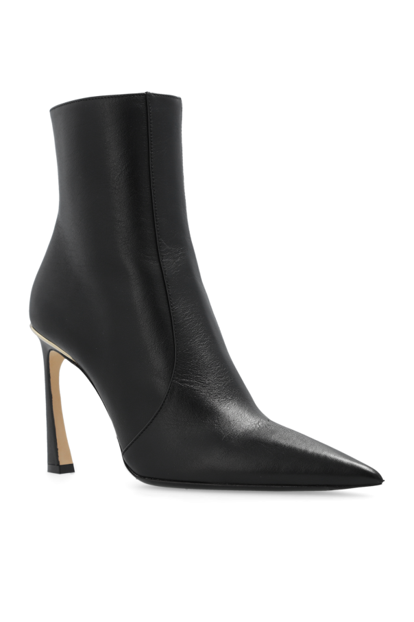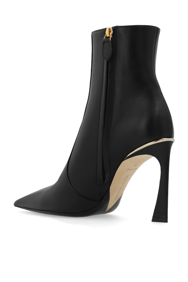 Black heeled ankle boots from Victoria Beckham. Made from leather with a pointed toe silhouette, this model sits on a beige and black leather sole and features a side zipper and gold-tone metal hardware at the back.