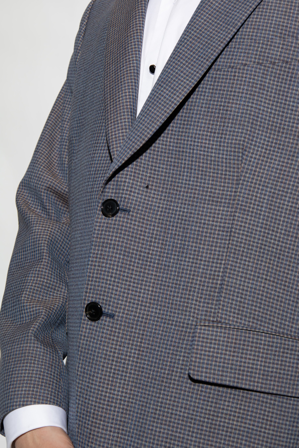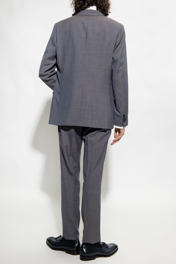 Bluish grey suit from Paul Smith. Crafted from wool with an orange check pattern. The blazer fastens with buttons and is complete with two flap pockets, one slip pocket, double rear vent, notch lapels and long sleeves with buttoned cuffs. The trousers have a zip, hook and button fastening, two slip pockets, two buttoned pockets and tapered legs.