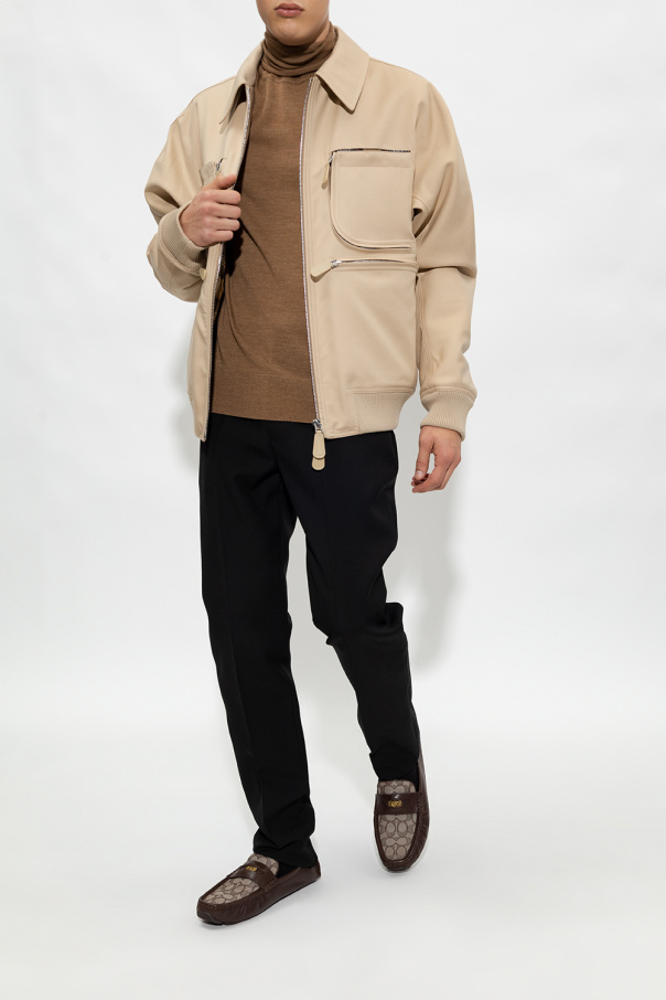 Brown and cream ‘C Coin’ moccasins from Coach. Crafted from leather and fabric, this model sits on a dark brown rubber sole and showcases a monogram pattern and gold-tone logo hardware on the front.