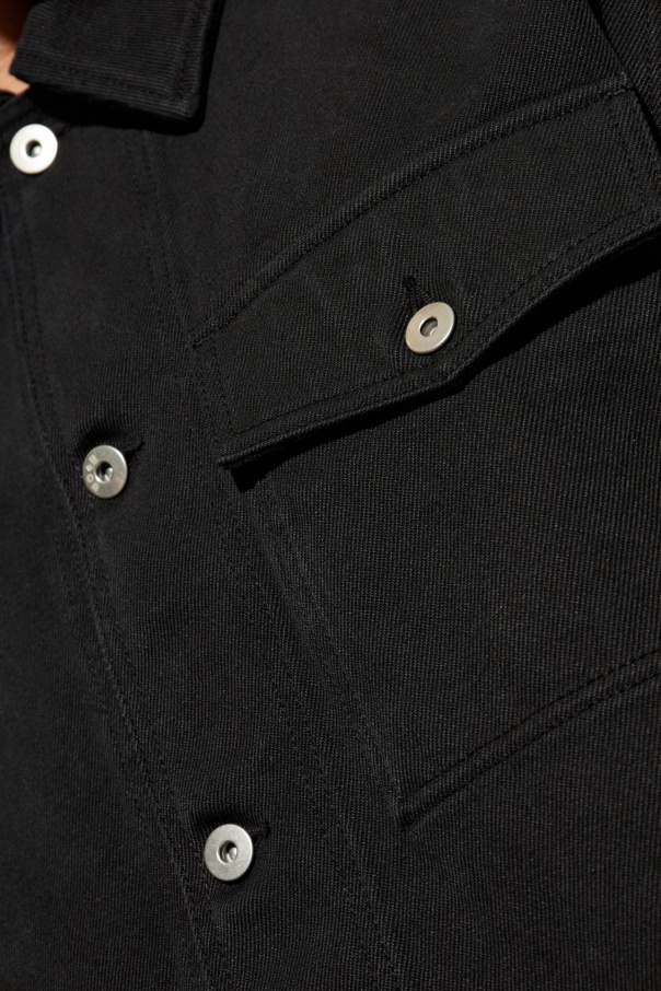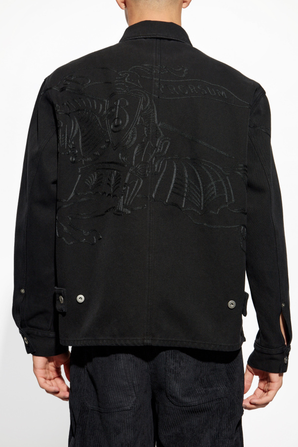 Product Name: Denim Jacket This classic denim jacket by Burberry epitomizes timeless elegance and understated luxury. Crafted from premium black denim, this jacket features a minimalist design, showcasing the impeccable craftsmanship that Burberry is renowned for. Material: 100% Cotton Distinguishing Features: The jacket boasts a sleek, straight cut that complements any silhouette. A single chest pocket with a button closure adds a touch of practicality, while the silver buttons provide a striking contrast against the rich black fabric. The sleeves are adorned with buttoned cuffs, enhancing both elegance and functionality. A standout detail is the intricate embroidery on the back, which infuses the piece with a unique character. This jacket also features double-stitched seams for added durability and adjustable straps on the lower back for a customizable fit. Why Buy This Product? Exquisite Craftsmanship: Designed by Burberry, a hallmark of sophistication and quality. Unique Detailing: Features exclusive embroidery on the back, making it a distinctive piece. Versatile Elegance: Perfect for both casual and formal occasions. Durability: Constructed with double-stitched seams to ensure longevity. Adjustable Fit: Equipped with adjustable straps for a tailored fit.