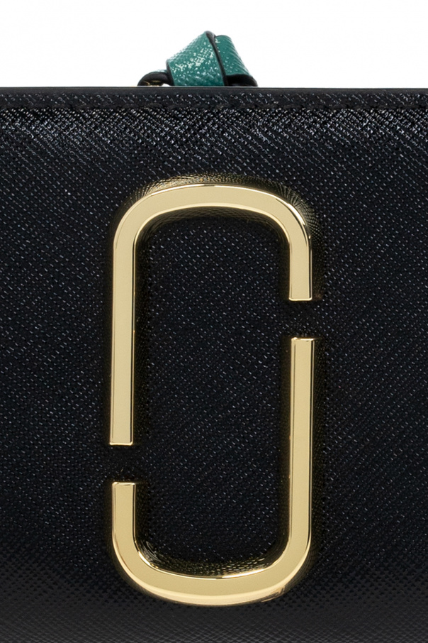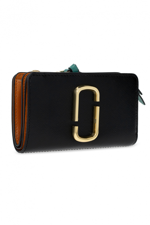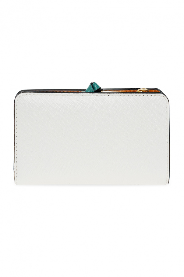 Black, white and brown wallet from Marc Jacobs. Made of cow leather, this design secures with a snap and features a logo application on the front, gold-tone metal hardware and ten card slots, two slip pockets and one zip pocket inside.