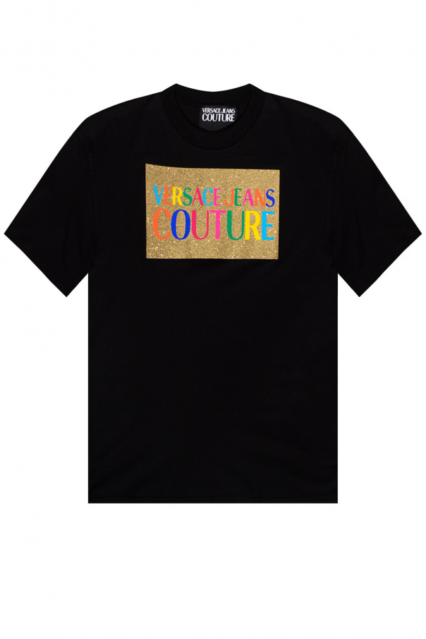 Black crewneck T-shirt from Versace Jeans Couture. Crafted from cotton, this style showcases a colourful logo print spruced up with gold-tone glitter on the front.